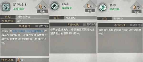 第二行:技能效果涵盖战败自爆造成伤害、加快建造速度、增加建造获取的名望以及提升策书恢复速度。主动技能【阴契爆木】存在伤害偏低、持续时长较短的问题,实际使用价值不高;【勤筑】能提升建造速度与建造所得名望,可依据自身需求进行加点;【养晦】的策书恢复效果,需结合策书上限值来合理分配加点。