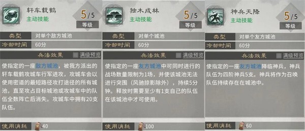 绝技(三选一):【轩车载鹤】攻城车伤害不俗,不过它会自行规划行军路线,很容易被卡住位置。但满级后要是搭配上第二行满级的主动技能【阴契爆木】的自爆效果,在一些特定战场里说不定能起到意想不到的作用。【独木成林】需要消耗较多策书,可它能让一座城池在5分钟内只进行一场战斗,不管是在本服还是跨服场景中都表现得十分强势。【神兵天降】的神兵队伍满级后的强度比【轩车载鹤】的攻城车稍低一些,所以不太建议选择。