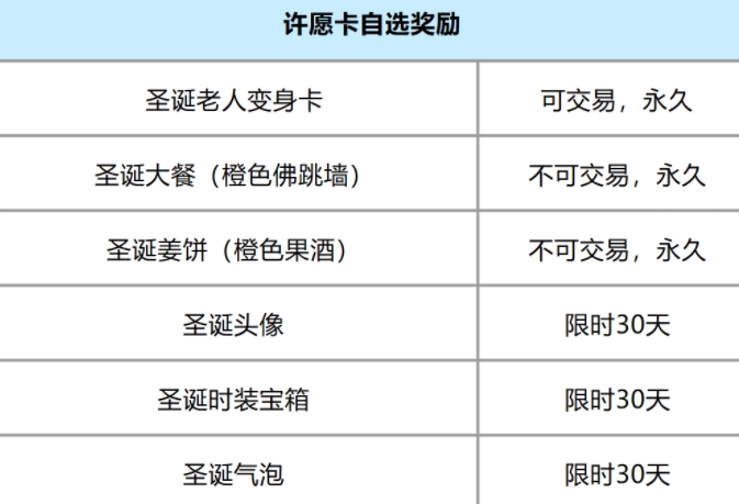 活动时间:12月24日更新后-12月30日5:00任务简介:玩家每日可接取任务,帮助圣诞老人寻找并送出礼物,完成任务后,将获得许愿卡道具。使用许愿卡,玩家可以从丰厚的奖池中自选获得一项奖励(仅能获得任一道具)