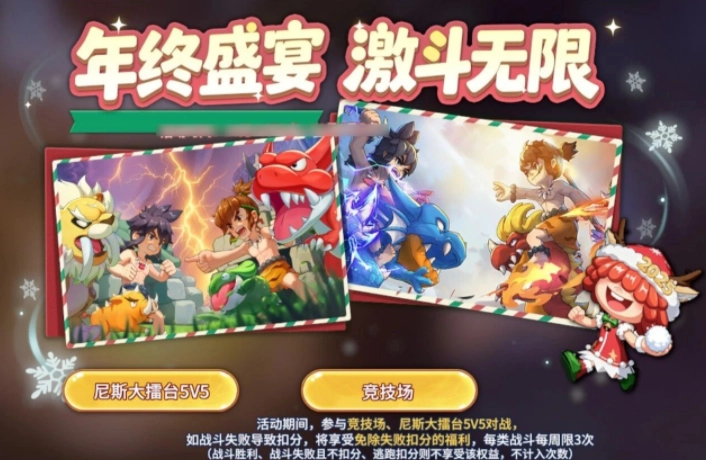 竞技场和尼斯大擂台的5V5玩法即将开启“失败不扣分”的保护机制,每周每个玩法各有3次机会(胜场或逃跑的情况不计入次数),这样能让玩家更轻松地参与到PK切磋之中。