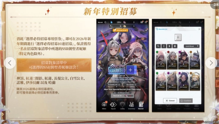 消耗「选择必得招募专用票券」,就能在2026年新年期间参与「选择必得招募10连招募」,确保获得招募对象清单里自己选定的一名SSR朝圣者妮姬(特定角色不在此列)。具体信息请查看招募界面的说明。
