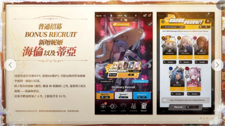 现有BONUSRECRUIT将加入新的妮姬,并提高最大兑换次数。
