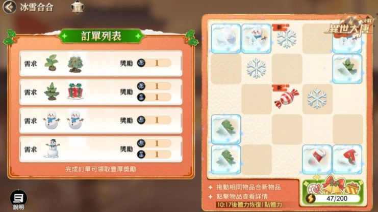 「冰雪合合」是一款基于方格的合成玩法,玩家通过拖拽相同物品进行合并,就能逐步合成更高级的节庆道具。从糖果拐杖变成圣诞帽,或是幼苗长成漂亮的圣诞树,每一次合成都会带来满满的惊喜与成就感。只要集齐指定的组合,就能完成【订单列表】里的任务,兑换活动限定道具「冰雪福禄」,用来换取珍稀的虚拟宝物!