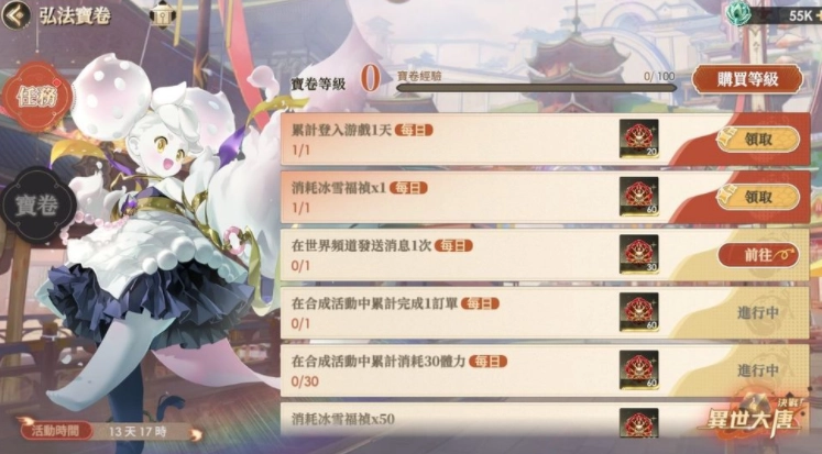 通过「弘法宝卷」完成每日指定任务(比如登录游戏、消耗福禄、合成道具、在世界频道互动等),就能积累宝卷经验并领取相应的虚宝。坚持参与活动还能解锁丰厚奖励,让冬日里的冒险之旅更有动力!