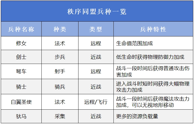 秩序同盟的兵种如下:
