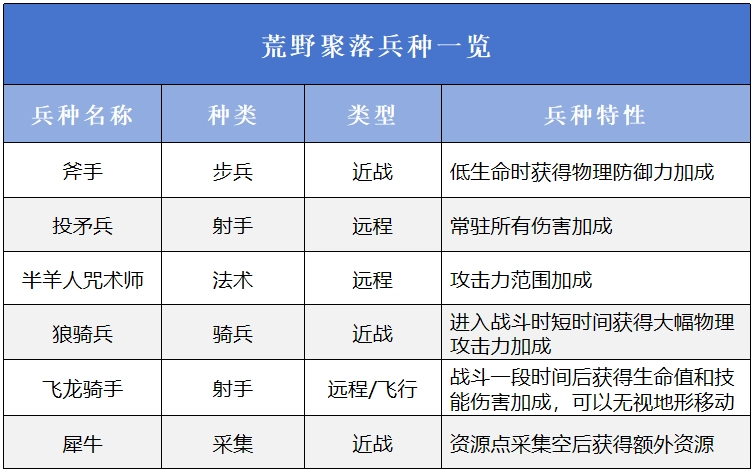 荒野聚落的兵种如下: