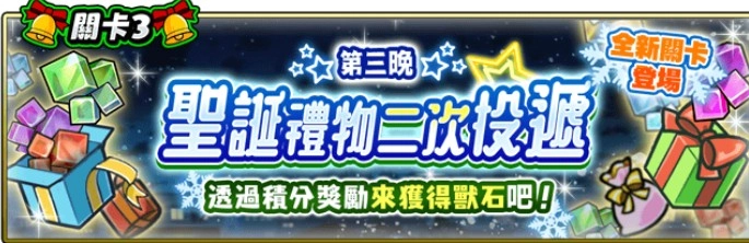 「第三晚圣诞礼物二次投递」新增了关卡内容。完成关卡后,能根据积分获取兽石、稀有券之类的积分奖励!