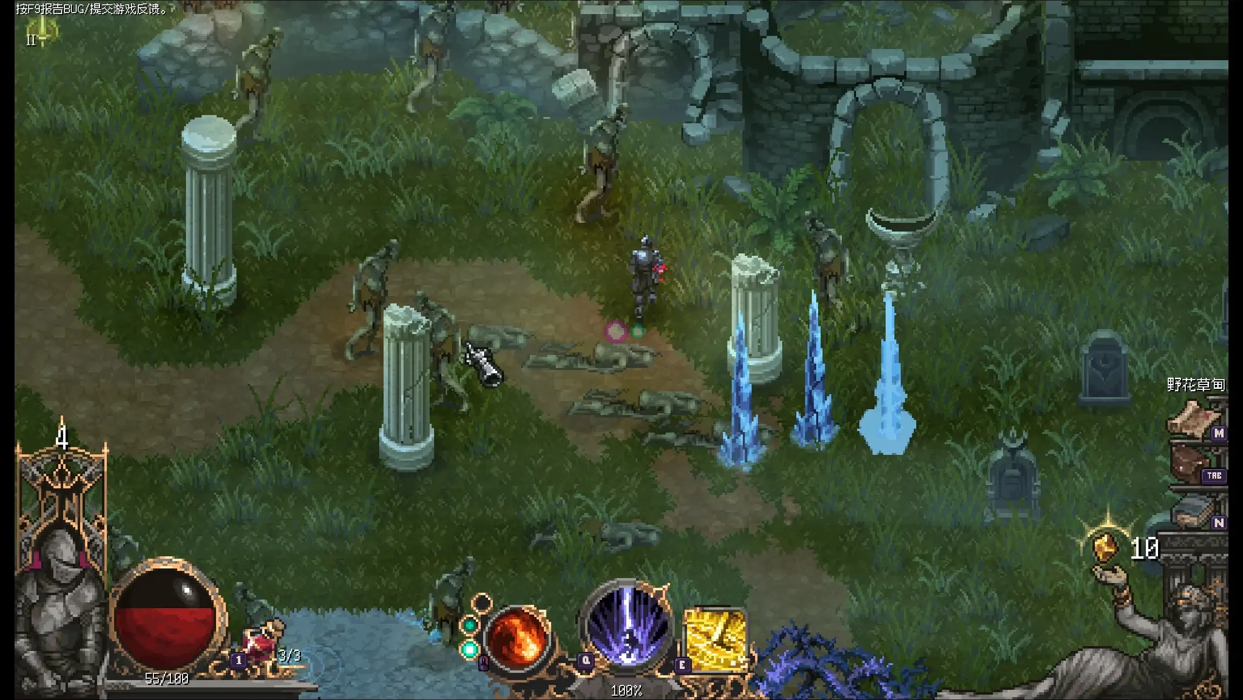 游戏里的攻击类型有普通攻击和法术攻击两种。普通攻击的攻速比较快,伤害也说得过去,但敌人的攻击速度更快,所以看到敌人要出手时得及时躲避,别想着多打几下。不过这个游戏主角的初始能力挺强的,被攻击后掉血不多,就算放在肉鸽游戏里,主角的性能也属于不错的,更不用和类魂游戏比了。