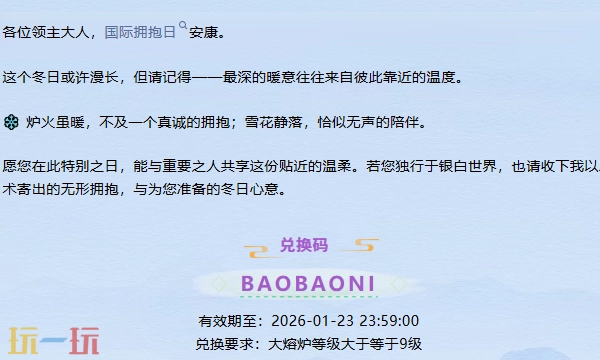 无尽冬日本周(2026年1月第3周)新增BAOBAONI和0120WJDR两个兑换码,使用条件为大熔炉等级≥9级。以下为大家整理了无尽冬日本周及长期通用兑换码的详细信息,感兴趣的领主们可不要错过哦。