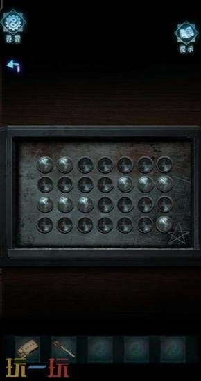 1、观察院子墙上的打油诗,第一排有2个字在方框里,第二排3个字在方框外,第三排3个字在方框外,第四排1个字在方框外;再看柜顶木匣子上的金属机关,每一排的按钮数量和每一句诗的字数一致,且第一排只有两个按钮没被摁下,据此得出“方框内的字对应的按钮需要被摁下”的线索;之后,将按钮密码调整成了如图所示的状态。