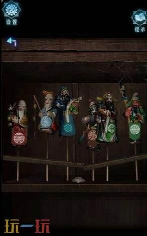 5、亥三刻时间调整后,天井池子石墩下方出现荧光图案,观察图案从左到右的顺序,根据荧光图案顺序,调整堂屋架子上的面人顺序为如图所示.