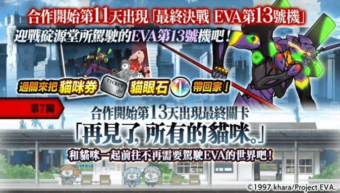 《新世纪福音战士》的角色即将亮相合作限定关卡!过往的合作关卡将全部复刻回归,同时,源自「新世纪福音战士剧场版」的强力挑战关卡「EVA量产机强袭」也全新登场!千万不要错过在《猫咪大战争》中重温《新世纪福音战士》故事的机会!