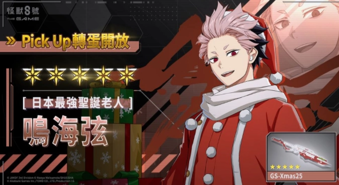 在本次更新中,身着圣诞老人装束的★5角色[日本最强圣诞老人]鸣海弦正式登场。游戏里能看到,鸣海弦一改平日形象,全身心投入到防卫队主办的圣诞节活动中,还为孩子们派送礼物。他本人表示:「这么做都是为了在孩子们当中收获超高人气」,不过真实原因其实是⋯⋯?