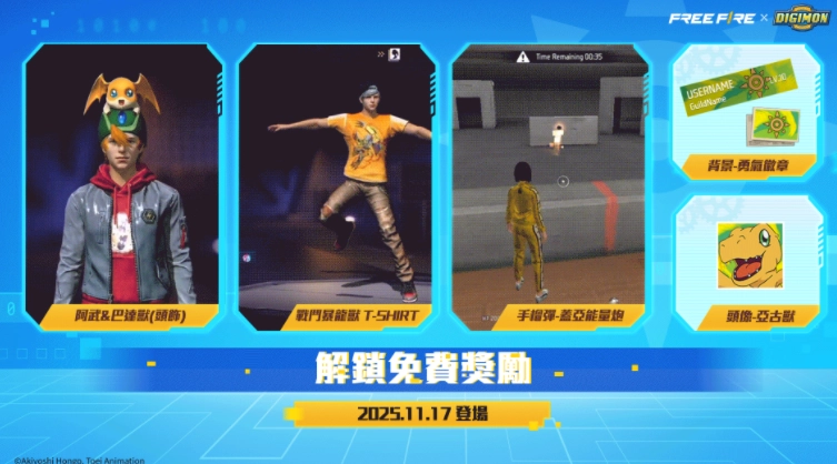 此外,活动期间登录并完成任务的玩家,还能解锁独家数码宝贝主题奖励,像阿武&巴达兽头饰、手榴弹-盖亚能量炮、战斗暴龙兽T恤等丰厚好礼都包含在内。当玩家在《FreeFire》开启这场令人兴奋的全新冒险时,数码宝贝粉丝与玩家们还有机会发现更多惊喜彩蛋。