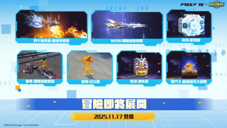 Garena宣布旗下游戏《GarenaFreeFire》将与经典动漫IP《数码宝贝大冒险》开启合作,11月17日,这部数码宝贝系列的首部电视动画将正式登陆游戏。届时,粉丝与玩家们有机会获取多款游戏内专属造型,比如阿武&巴达兽主题头饰、盖亚能量炮样式的手榴弹、机械暴龙兽外观的野牛衝锋枪,还有亚古兽宠物等内容。
