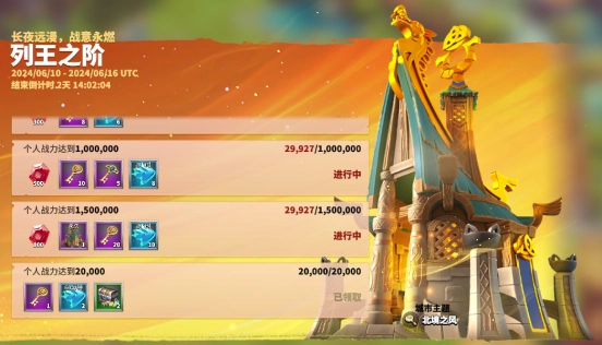 列王之阶是一项为期七天的战力冲刺活动。在这七天里,每当达成一个战力目标,就能获得宝石、钥匙、加速道具、资源等奖励。