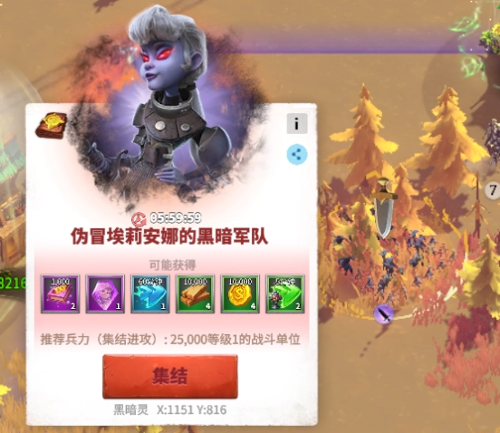 当你使用遗落的魔傀后,在你的城市周边会涌现出一支伪冒埃莉安娜的黑暗军队。只要发起集结并成功击败这支军队,就有一定概率获取战术手册、埃莉安娜的信物、加速道具以及资源等物品。