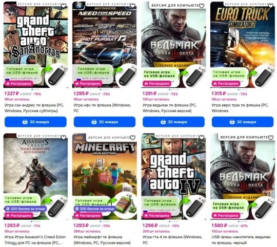 俄罗斯电商平台Ozon的用户发现了一种特别的游戏销售方式。平台商品目录里出现了可购买过去热门游戏的商品,这些游戏都被预先安装在普通U盘里。在这些商品中,角色扮演游戏《巫师3:狂猎》格外受关注,由名为"БЕРИ ПРОСТО"的卖家以大约1300卢布(相当于人民币119元)的价格售卖。