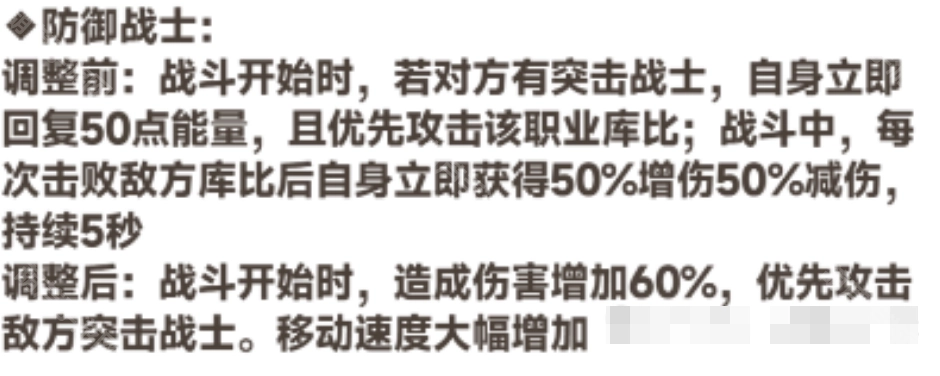 防御战士的机制调整如下:移除了对位突击战士时立即回复50点能量,以及每次击败目标获得50%增减伤效果的设定;取而代之的是新增造成伤害提升60%和移动速度增加的效果。