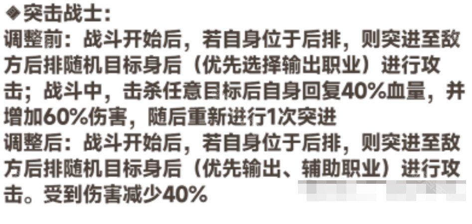 突击战士:取消了击杀目标后回复40%生命值、提升60%伤害并可再次突进的机制,调整为获得40%伤害减免效果。