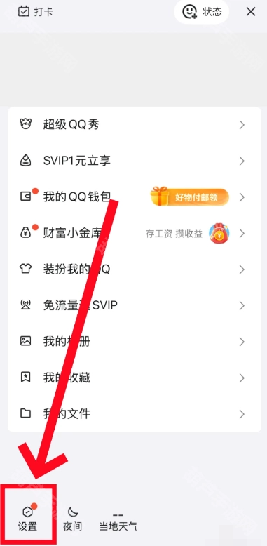 1、第一步是打开手机QQ应用,点击界面左上角的头像,这样就能调出左侧的菜单栏,接着在菜单栏底部找到并进入设置页面。