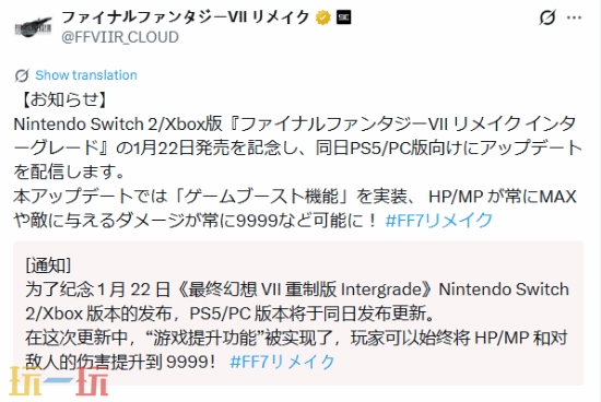 《最终幻想7:重制版Intergrade》将于1月22日登陆NS2与Xbox平台,与此同时,PS5和PC版本也将迎来包含“GameBoost”功能的更新补丁,该补丁会提供HP/MP锁定、秒杀敌人等强力辅助选项。