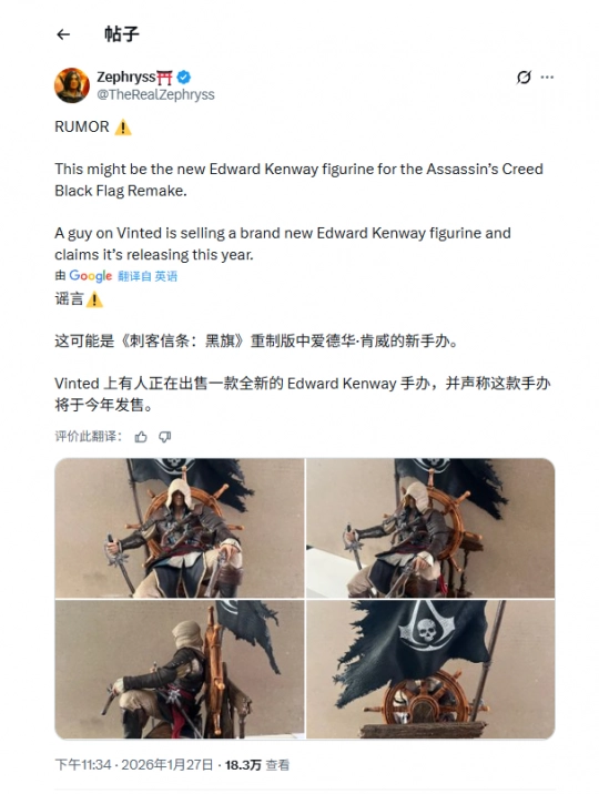 本周,一款疑似《刺客信条4:黑旗》重制版相关的爱德华·肯威手办在网络上出现并迅速在社交平台传播。之后,《刺客信条》官方账号在社交媒体发布了《侠盗猎车手:圣安地列斯》中CJ的经典台词截图“啊,见鬼,又来了”,这被外界广泛解读为对该传闻的回应。