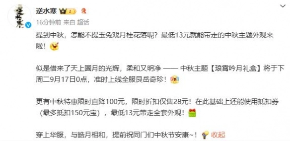 1、【琅霄吟月礼盒】这一中秋主题礼盒,将于2024年9月17日0点准时上线。