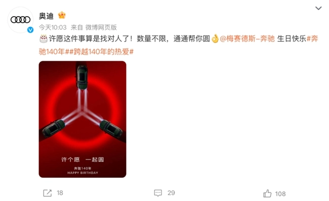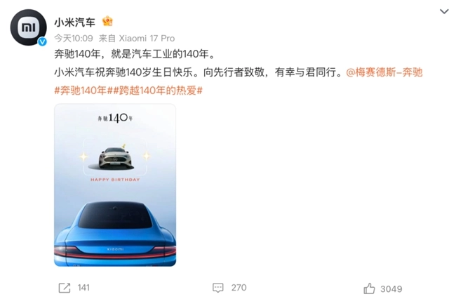 此次梅赛德斯-奔驰140周年纪念活动在汽车行业掀起了广泛互动热潮,北汽、小米汽车、凯迪拉克、别克、奥迪等传统车企品牌,以及理想、蔚来等新能源汽车新势力,都借助官方平台向其表达了诚挚的祝福。