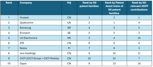 在全球5G专利实力的排名中,华为、高通、三星与爱立信这几家领军企业,凭借已授权且有效的5G专利族数量、专利组合所具备的影响力,以及在标准制定上的贡献度,始终处于领先地位。