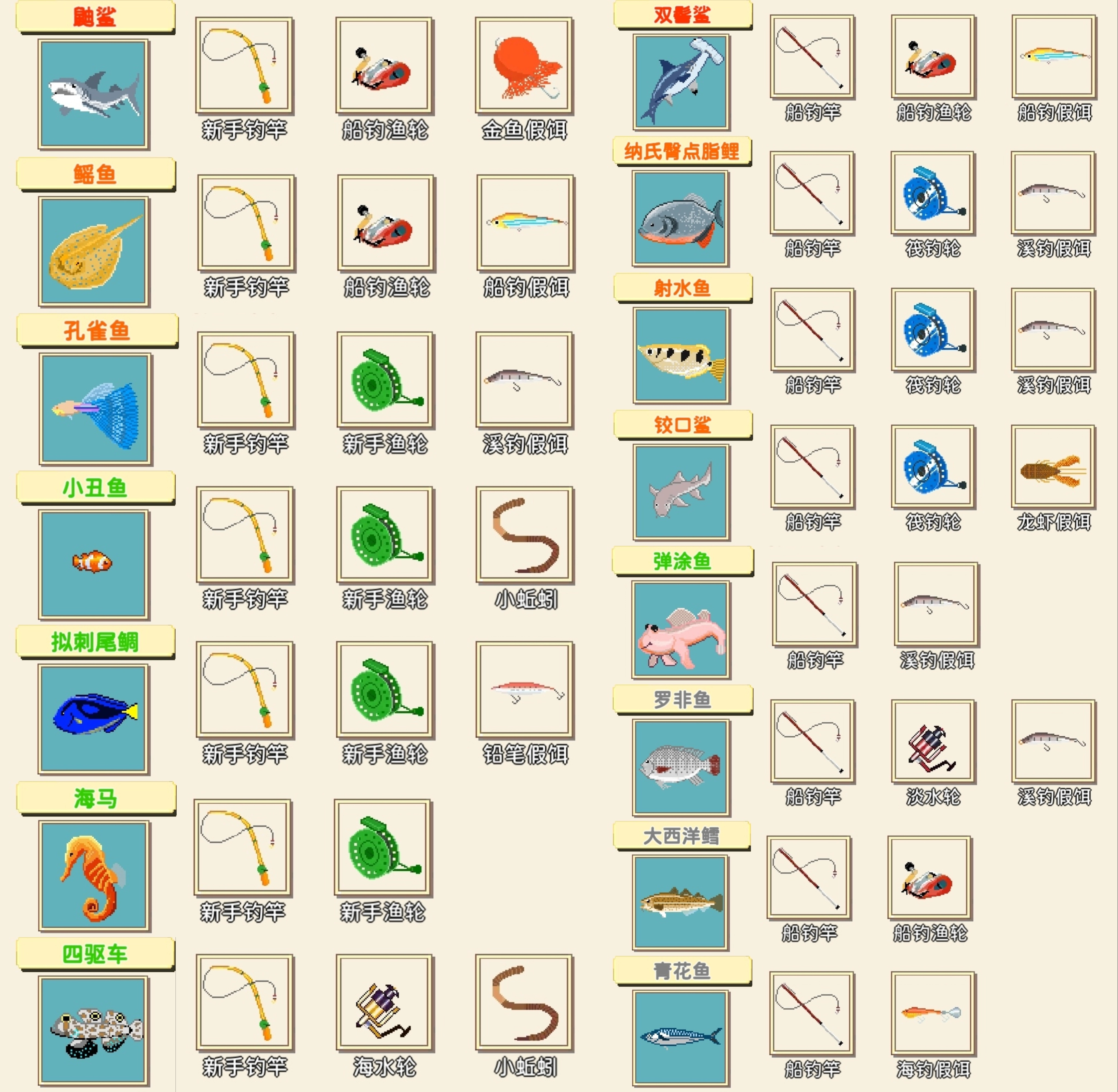 3、孔雀鱼:所需装备为新手钓竿、新手渔轮以及溪钓假饵。