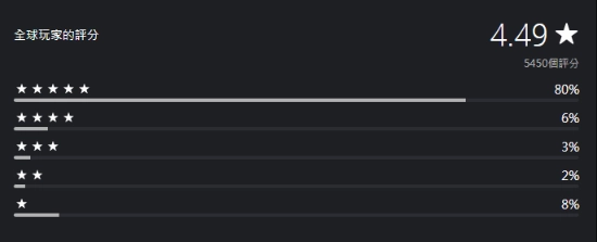 目前,该游戏在PS商店的Demo评分功能已开启,截至当前共收到5450条评分,整体评分为4.49分,其中给出五星满分评价的占比达80%。