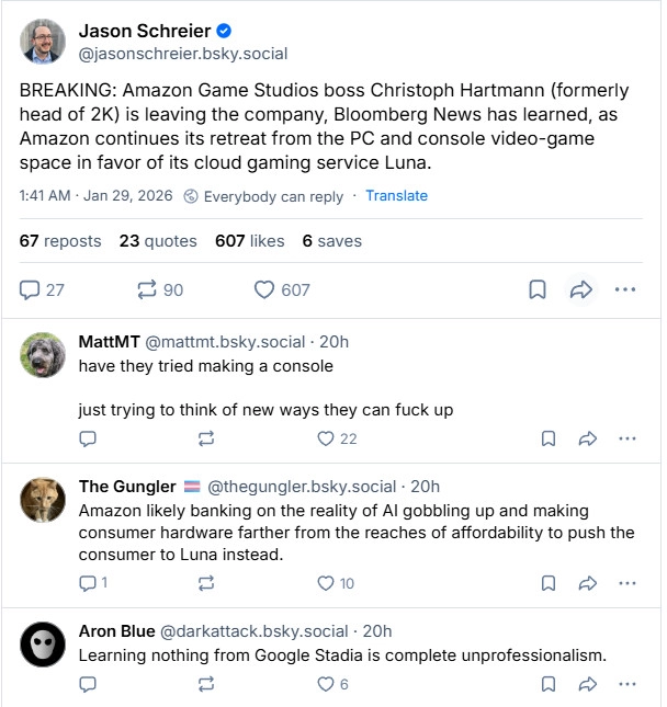 亚马逊游戏工作室负责人Christoph Hartmann即将离职,此前该公司已裁员约1.6万人。目前亚马逊正逐步收缩游戏业务规模,将重心转向云游戏服务Luna,此次人事变动恰逢这一调整阶段。