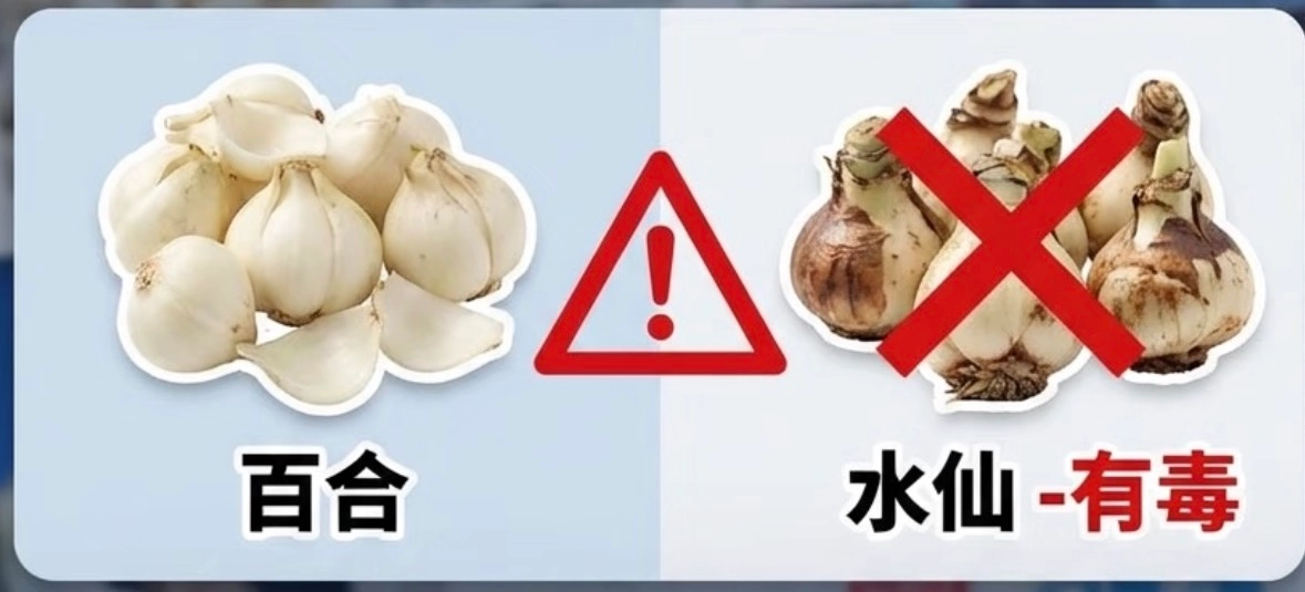 不少人或许会疑惑,百合与水仙的外形真有那么相似吗?怎么会容易混淆呢?这里小雷得着重给大家科普一下,它们看着相像,但一种能够食用,另一种却带有毒性。我来教大家这两个区分的办法。