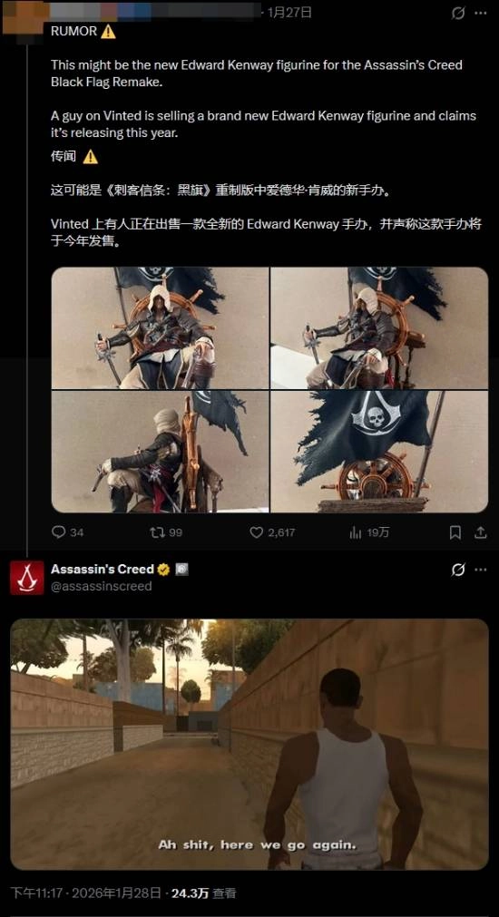 这张手办图曝光后,很快在《刺客信条》粉丝群体里引发了广泛讨论,育碧官方甚至亲自回应,还配上了《GTA:圣安地列斯》里那句经典台词:“Ah shit, here we go again(靠,又来了)”。