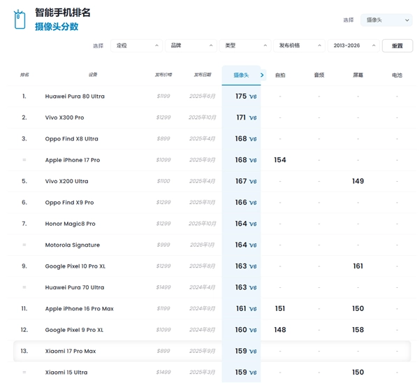 在DXOMARK影像第六版基准测试中,小米17 Pro Max取得了159分的综合成绩,在DXO全球影像排行榜上位居第13名,和小米15 Ultra处于同一排名位置。