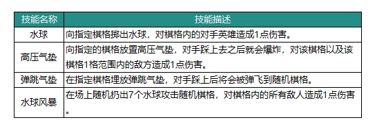 水球技能:朝着指定的棋格投掷水球,会对处于该棋格内的敌方英雄造成1点伤害。