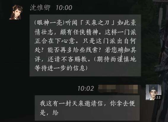 玩家:我这儿有一封天泉邀请信,你拿去用吧,给你。