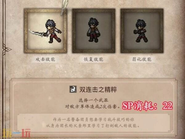 《歧路旅人0》中的双连击之精粹是一款强力的物理系技能道具,使用时需消耗22点SP,玩家可选择一种武器对敌方单体发动两次攻击。该道具的获取途径较为特殊,仅能在游戏开局选择初始物品时获得,它是影响主角初始战斗风格走向的关键选项之一,其技能原型来自主角从担任警备团团长的父亲那里学来的战斗技巧。