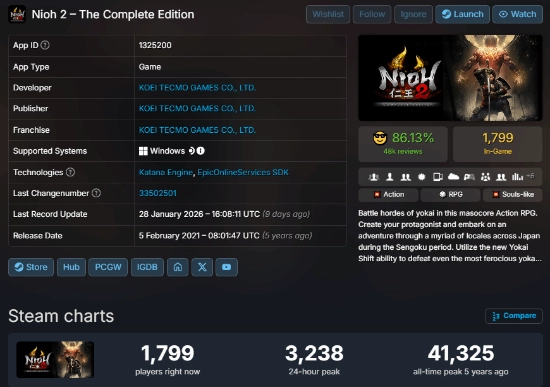 这一成绩已然超过系列过往作品:初代《仁王》在Steam平台的同时在线峰值为10,649人,《仁王2》则达到41,325人,而《仁王3》无论是热度还是首发阶段的关注度,都刷新了系列的最高纪录。不过需要说明的是,《仁王1》和《仁王2》在首发时并未同步登陆PC平台,这在一定程度上对它们在Steam上的热度表现产生了影响。