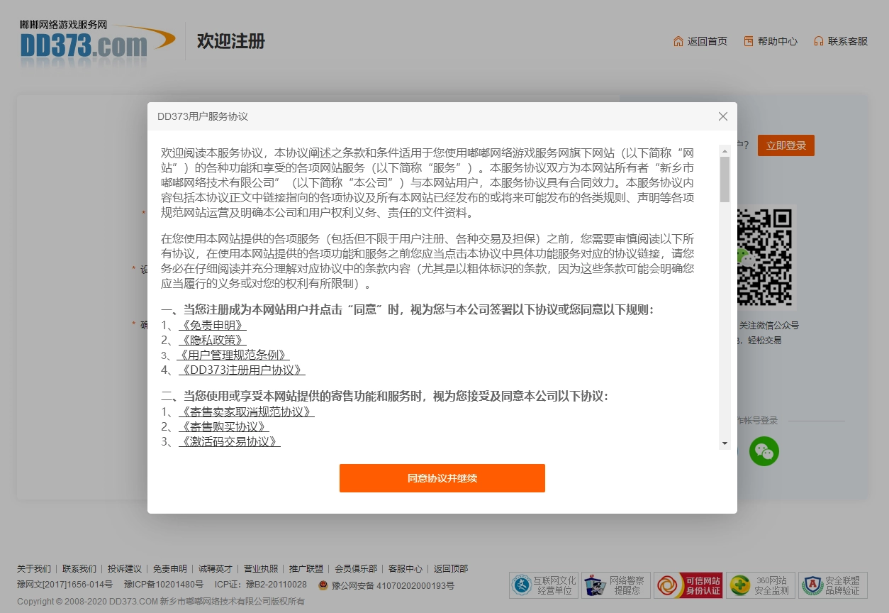 4、进入注册页面后,请仔细阅读《DD373用户服务协议》,阅读完毕若同意注册相关条款,可点击“同意协议并继续”按钮。