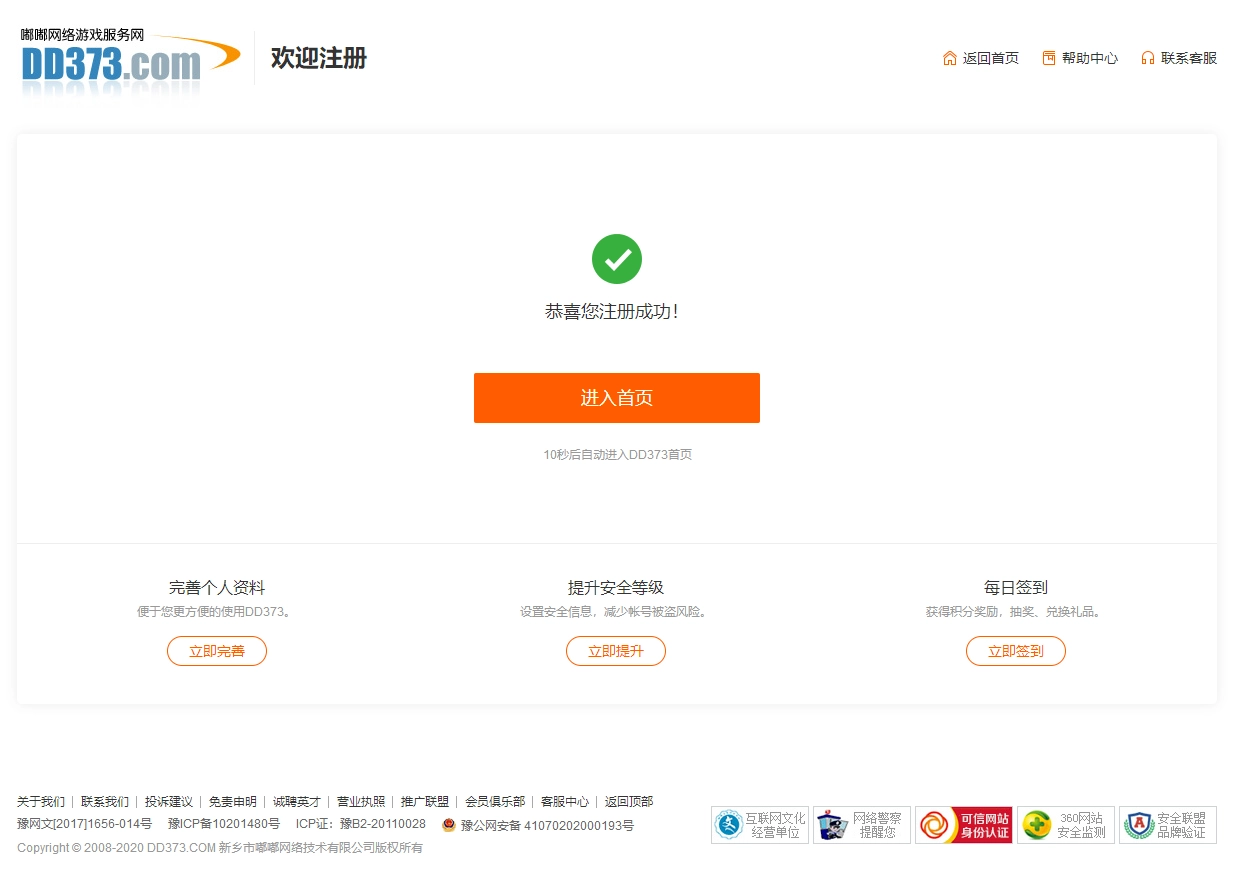 12、点击“立即注册”按钮,若您填写的资料准确无误,系统会自动跳转至注册成功提示页面,这意味着您已成功注册DD373!