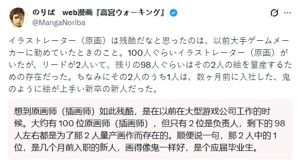 现在是漫画作者的Noriba发文回忆道:“以前在大型游戏公司任职时,我真切体会到插画师这份职业的残酷性。公司里大概有100位插画师,可其中只有2位是主美,剩下的98人大多都在按照这两位主美的设计,进行美术资源的批量制作。说起来,这两位主美里有一位是刚毕业不久、入职才几个月的新人,他有着过人的天赋。”