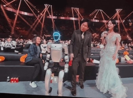 现场还出现了极具戏剧性的一幕:当舞台上的机器人随着音乐热情舞动时,镜头突然转向观众席,捕捉到黄渤、王嘉尔、陈伟霆、白敬亭四位明星的实时表情。