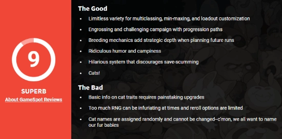 近日,GS为《以撒的结合》创作者E胖的回合制策略RPG新作《喵喵的结合》给出9分的高评分(IGN也同样打出9分)。测评人员表示,这款游戏凭借富有挑战性的玩法、极为丰富的深度以及戏谑的幽默感,能让玩家沉浸其中长达数小时,堪称一场“喵”妙无比的轻度Rogue冒险体验。