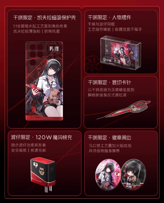 除了手机本身和系统外,红魔11 Pro+鸣潮限定版还附带了多款《鸣潮》千咲主题的周边产品。