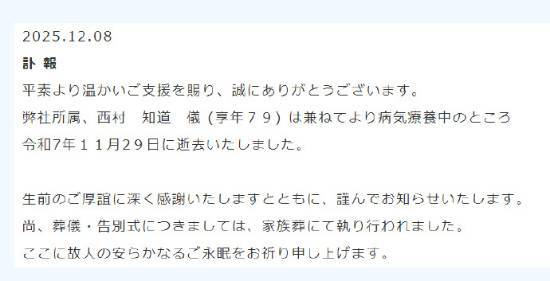 西村知道所属事务所发布的讣告表明,他于2025年11月29日离世,享年79岁。讣告中提及他此前一直在因病疗养,而葬礼将遵照家属的意愿,以家族葬的形式举办。