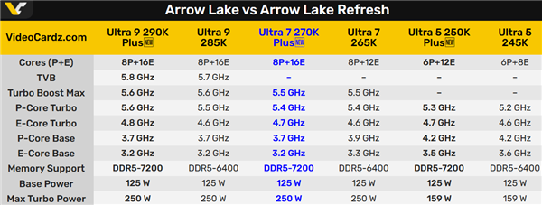 另外,内存频率统一从DDR5-6400提升至DDR5-7200,而热设计功耗保持不变。