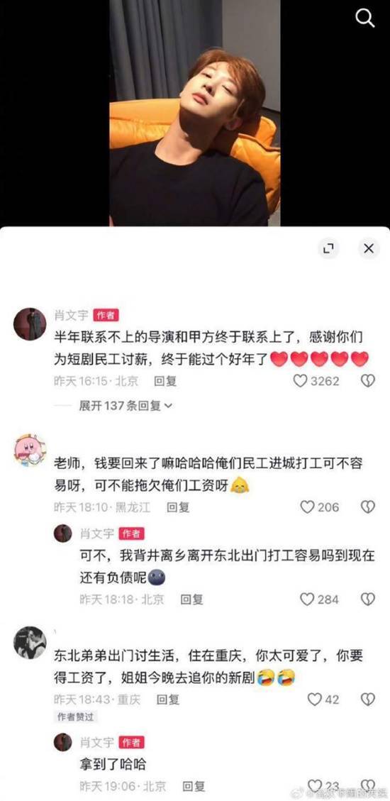 据潇湘晨报报道,近日,短剧演员肖文宇在其主演的短剧评论区留言“片酬结了吗,你就上?”,引发网友关注并为他发声。随后肖文宇回应称,已收到此前被拖欠的片酬,并表示“通常情况下我不会催,但这次都半年了还没消息,实在没办法才这么做”。