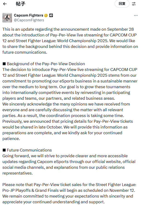 尽管玩家批评声不断,官方仍计划按原定安排推进票务销售。付费直播的具体价格与细节将在协调结束后公布,而街头霸王联赛Pro-JP季后赛与总决赛门票将于11月12日开始发售。